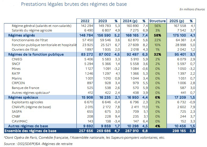 Les pensions brutes versées par les régimes de retraite de base se sont élevées à 269,7 Md€ en 2023 et atteindraient 287,9 Md€ en 2024 (+6,8%) et 298,2 Md€ en 2025 (+3,6%). Les pensions de base seraient versées en 2024 à 58% par les régimes alignés (régime général et régime agricole des salariés), 32% par les régimes de la fonction publique, 6% par les régimes spéciaux et 4% par les autres régimes de base (essentiellement des régimes de non-salariés).