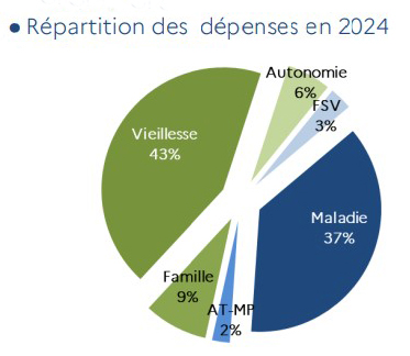 .Les dépenses sont consacrées à: - Soins de ville et autonomie - Prestations maladie - Prestations de retraite - Prestations familiales - Gestion administrative - action sociales de la prévention |