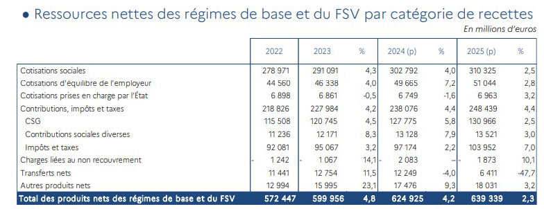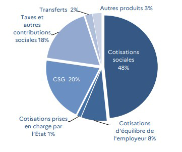 recettes sont composées de: - Les cotisations - La CSG - Impôts et taxes - prélèvements sur les revenus du capital |