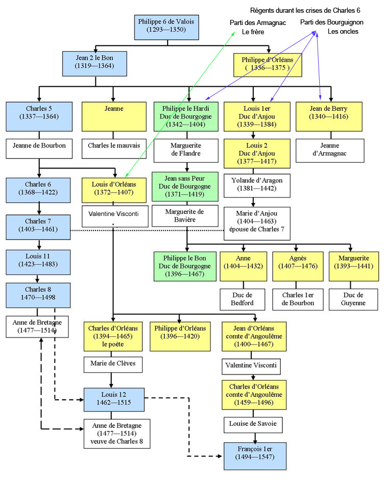 DESCENDANCE DE PHILIPPE 6 DE VALOIS (parenté de Charles 6 dont les crises de folie sont à l' origine de la guerre entre les Armagnac et Bourguignon)
