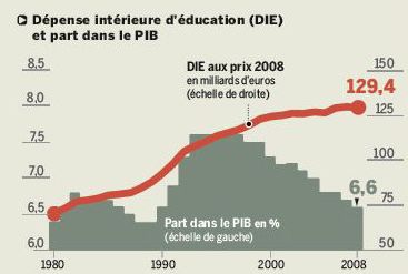 Si la courbe des dépenses d'éducation a tendance à plafonner la part de PIB consacrée à l'éducation est décroissante depuis 1995. De 7,6% du PIB les dépenses d'éducation sont passées à 6,6%.