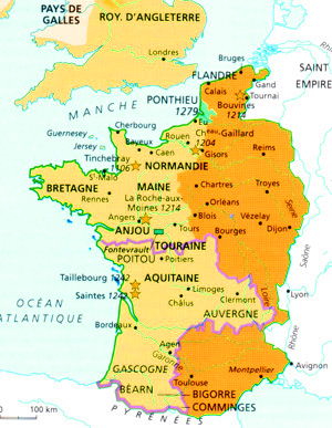 Aliénor d'Aquitaine ( 1122 - 1204) qui était mariée à Louis 7 et dont le mariage a été cassé, est en 1152 le plus beau parti de France. Elle épouse cette même année Henri Plantagenet leurs domaines réunis couvrent plus de la moitié de la France. Elle a 30 ans et lui 19. En 1153 Henri débarque en Angleterre avec ses troupes et il conclura un accord avec Etienne de blois , accord qui prévoit qu'il prendra la succession du roi après sa mort. Etienne meurt l'année suivante. En 1154 Henri Plantagenêt devient roi d'Angleterre sous le nom de Henri2 et Aliénor d'Aquitaine qui fut reine de France devient reine d'Angleterre Henri 2 est donc un roi très puissant et il lui sera difficile de s'incliner devant le roi de France Henri 2 a soif de conquêtes il va tenter notamment de prendre le duché de Toulouse mais renoncera devant le roi Louis 7. Etre roi d'Angleterre et seigneur d'un vaste domaine en France n'est pas facile. La traversée de la manche avec les bateaux de l'époque et une armée ne peu se faire que par beau temps. Partir conquérir des territoires sur le continent s'est s'absenter plusieurs années. Pendant ce temps en Angleterre on oublie qu'il y a un roi. Henri et Aliénor ont 4 fils Henri le jeune qui héritera du trône de la Normandie et de l'Anjou, Richard , futur Richard cœur de Lion aura l'aquitaine, Geoffroy par son mariage avec Constance de Richemont possède la Bretagne , Jean est lésé on l'appellera des lors Jean sans terre. Louis 7 devant la puissance du roi d'Angleterre va tenter de semer le trouble dans le camp anglais mais ne parviendra pas à reconquérir le moindre territoire. Il meurt en 1180 son fils Philippe 2 dit Philippe Auguste va s'atteler à la tâche En 1189 Henri 2 Plantagenêt meurt à son tour. Les deux ainés de Henri 2 sont morts également l'un en 1183 l'autre en 1186. C'est Richard qui lui succède. Il est brutal et impulsif .