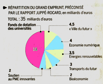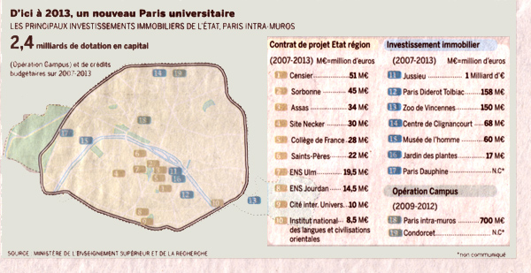 Le gouvernement annonce en janvier 2008 le "plan campus". Il se propose de moderniser 10 pôles universitaires regroupant universités grandes écoles, centre de recherches et établissements de l'enseignement supérieurs. Il sera financé par la vente d'une partie de la participation de l'Etat dans EDF à hauteur de 5 milliards d'euros. Un appel à projet a été fait, dans un premier temps 6 projets ont été retenus Strasbourg, Lyon, Grenoble, Bordeaux, Montpellier et Toulouse dans un second temps 3 nouveaux projets ont été ajoutés Aix Marseille, Saclay, Paris Aubervilliers, un projet pour Paris intra muros n'est pas encore défini. Le Nord et l'Ouest de la France ne bénéficient pas de ce plan. Dans un deuxième temps, un emprunt national doit être effectué . Michel Rocard et Alain Juppé ont été chargés de réfléchir sur l'emploi de cet emprunt. Leurs suggestions orientent une grande partie de cet emprunt vers l'enseignement supérieur et la recherche.
