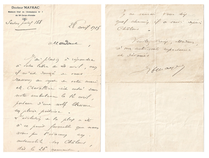 UN BLESSE EN 1915 Ma grand-mère n'ayant plus de nouvelles de son mari au front s'est adressée à la croix rouge . Quelques temps après elle reçut cette lettre du médecin . Vous remarquerez outre la politesse de ce médecin le terme de "noble blessure en pleine poitrine"