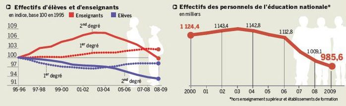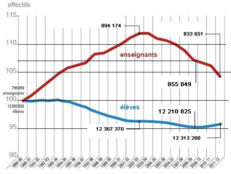 Sur les courbes de gauche ci dessus qui émanent du ministère de l'Education Nationale on peut voir une décroissance plus prononcée de la courbe des enseignants du second degré comparée aux effectifs. Sur la seconde courbe , les effectifs de l'éducation nationale ont été réduit de 157 800 depuis 2002. Sur les courbes de droite seuls les enseignants apparaissent et non pas le personnel dans sa totalité. On peut constater que la courbe des élèves passe par un minimum en 2008-09 avec un effectif (calculé par mes soins) de 12 210 825 et un nombre d'enseignants de 855 849 . En 2012 l'effectif des élèves s'est accru de près de 100 000 élèves alors que le nombre d'enseignants a poursuivi sa décroissance de plus de 22 000