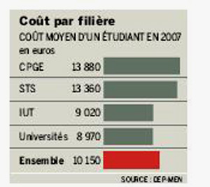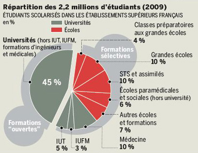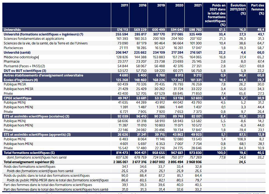L'année scolaire 2010 - 2011 les établissements d'enseignement supérieur accueillent 2 318 700 étudiants. Le tableau ci dessous fait état de l'évolution des différentes formations. Certaines formations figurent dans plusieurs rubriques par exemple les ingénieurs universitaires sont comptabilisés dans université et dans formation d'ingénieur. Le total indiqué en bas des colonnes tient compte de ces doublons