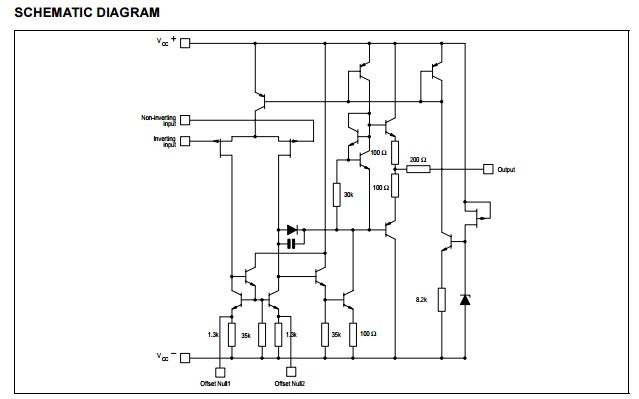 μA741 | Bipolaire | 2 kΩ | 80nA | 0,5 V/μs | 1 Mhz | 25mA |