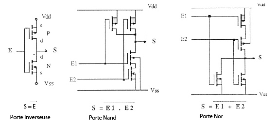 Circuits CMOS Low Stand-By Power Complementary Field Effect Circuitry Au départ, les CMOS ont été présentés essentiellement comme des circuits qui ne consomment pratiquement rien au repos, ce qui est vrai, mais ces circuits vont bien au delà de leur faible consommation. exemple: les portes CMOS ci dessous, on remarque leur extrême simplicité, pas d'autres composants que les transistors, les entrées ont une très grande impédance , juste les capacités grille substrat à charger