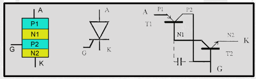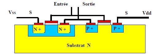 on sait que dans un thyristor, si nous alimentons l'anode A avec une tension positive par rapport à la cathode K, c'est la couche N1,P2 qui bloque la tension. Si on injecte des porteurs N dans la couche P2 à l'aide de la grille G cette barrière de potentiel disparait et le thyristor se met à conduire. Il faudra faire cesser le courant pour qu'il puisse se rebloquer. Considérons maintenant le schéma équivalent du thyristor à l'aide des 2 transistors, on voit que pour que T2 conduise, il faut que T1 conduise et pour que T1 conduise il faut que T2 conduise. Il suffit d'amorcer l'un des deux transistors pour que l'ensemble conduise. On sait également que si l'on applique brutalement la tension entre A et K un courant de charge de la capacité parasite (N1-P2) peut être suffisant pour amorcer l'ensemble. C'est l'auto-amorçage des thyristors qu'on évite les protégeant à l'aide de condensateurs. Les premières portes CMOS de la famille CD4000 de RCA étaient sensibles à ce phénomène et il était recommandé de modérer la vitesse de montée de la mise sous tension des circuits au risque de court-circuiter l'alimentation par effet de Latch-up . Les effets de latch-up furent corrigés en diminuant le gain des transistors parasites notamment à l'aide d'oxydation profondes. Propriétés d'origine des portes CMOS Les portes CMOS ne consomment