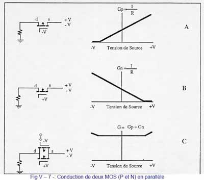 Les deux transistors de la figure ci dessus pilotés en +V -V ont une conduction quasi constante pour tous signaux compris dans cette fourchette . Si on inverse les commandes, +V sur le MOS P et -V sur le MOS N, le circuit bloque tous signaux compris entre ces deux tensions.