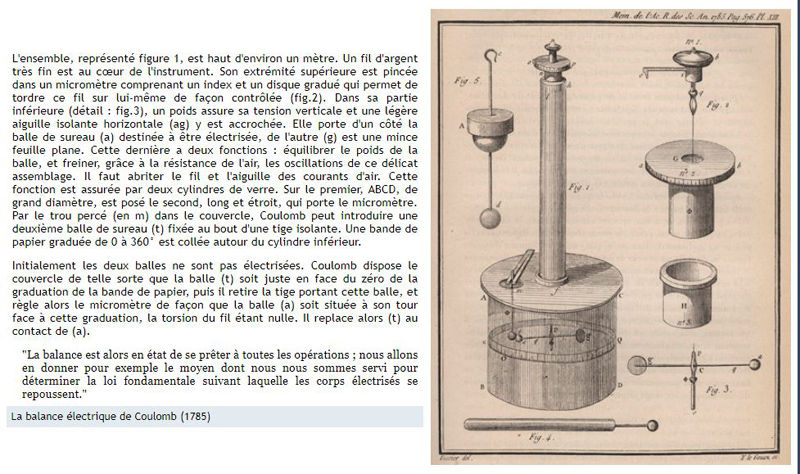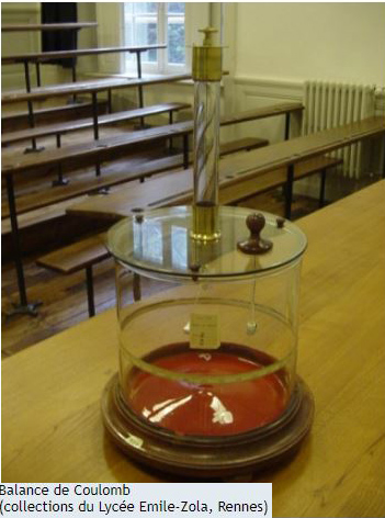 «roideur» des câbles, stabilité des voûtes (wikipedia) . Dans le cadre qui nous concerne particulièrement nous retiendrons ses travaux sur l'électrostatique. Expérimentateur très rigoureux, c'est en 1786 qu'il mesura, à l'aide d'une balance de torsion, la force qui s'exerce entre des charges électriques est proportionnelle à 1 / d2 . Il faudra une vingtaine d'années pour que sa loi soit admise