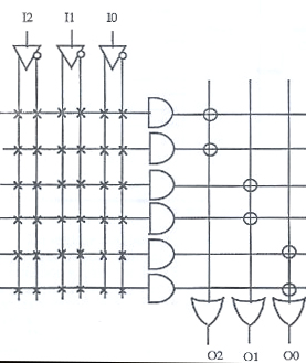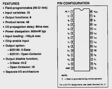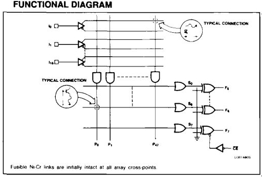 FPLA (Field Programmable Logic Array ) 82S100. Le schéma interne est voisin des fonctions représentées ci dessus les