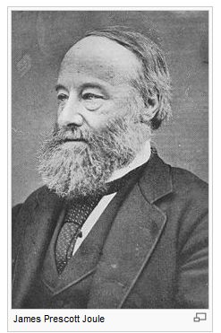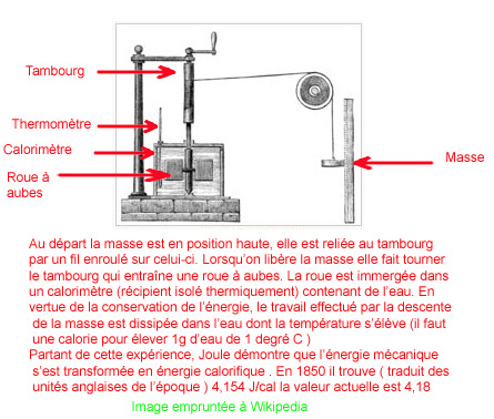 Joule travaille sur l'équivalent mécanique - chaleur qui va le conduire à énoncer la première loi de la thermodynamique sur la conservation de l'énergie. Pour vaincre le scepticisme des savants de l'époque il crée le dispositif expliqué à droite . Joule s'attache également à établir la relation entre la quantité de chaleur dégagée par une résistance électrique et le courant qui la traverse. Joule va également travailler avec Lord Kelvin à établir une échelle des températures absolues . Il travaillera également sur la magnétostriction effet dont il démontre l'existence en 1847 en mesurant la variation de longueur d'un morceau de fer sous l'effet du champ électrique Le nom de Joule a été donné