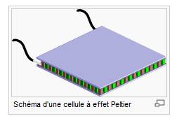 Thomson ( lord Kelvin) a mis en évidence le lien entre les deux phénomènes effet Seebeck et effet Peltier, et notamment quantitativement Il existe des modules à effet Peltier constitués de deux plaques l'une portant une multitude de soudures du type T2 l'autre de type T1 tous les couples sont placés en série. Lorsqu'un courant circule toute les soudures d'un type s'échauffent et de l'autre se refroidissent. Il y a transfert de chaleur d'une face à l'autre. Ce type de module peut être employé pour stabiliser la température d'un élément de taille réduite tel qu'un composant électronique dont la température doit rester rigoureusement constante. Un asservissement régule l'intensité et le sens du courant dans le module, l'information "température" étant donnée par un capteur constitué d' une résistance de platine au contact avec le composant électronique .