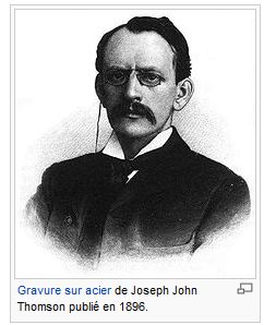 Titulaire de la chaire Cavendish de physique expérimentale à Cambridge, il fait des recherches sur les rayons cathodiques En 1897, il prouve expérimentalement l'existence de l'électron. Existence qui avait été pressentie en 1874 par Stoney qui avait baptisé les particules d'électricité "électron " en 1894 Il va montrer que le rayon cathodique est dévié par un champ magnétique et par un champ électrique. Il détermine que le rayon cathodique est composé de particules chargées négativement . Thomson va alors s'intéresser expérimentalement au rapport e/m des particules qui composent le rayon cathodique, faisant une expérience similaire avec des ions + d'hydrogène (atome d'hydrogène auquel la charge négative a été enlevée) , il va trouver que le rapport e/m du rayon cathodique est mille fois plus grand que celui de l'ion+. Il pourra en déduire que la masse m est beaucoup plus petite que celle de l'atome d'hydrogène . Thomson va conclure, et cela va faire une révolution, que les rayons cathodiques sont composé de "corpuscules" très petits, chargés négativement, extraits des atomes de la cathode. Ce sont, ce qui avait été pressenti par Stoney, des électrons. Ce qui va bouleverser la physique c'est que l'atome est donc divisible. Il va annoncer sa découverte en 1897 et va faire sensation Il obtiendra le prix Nobel de physique en 1906 Il va déduire également de ses expériences que l'hydrogène ne