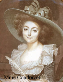 le salon de madame de Staël: Fille du banquier genevois et dernier grand ministre de Louis 16 Germaine Necker épouse en 1786 le baron de Staël-Holstein ambassadeur de Suède. Mariage mal assorti. Elle publie en 1788 un vibrant hommage à JJ Rousseau. Le salon de Madame de Staël devient un centre de la vie parisienne et se politise au fur et à mesure de la révolution. Elle se passionne pour la politique et essaie de faire triompher le modèle Anglais. Lorsqu'en 1792 ses amis politiques sont vaincus, elle se réfugie en Suisse. Elle reviendra après la réaction thermidorienne le salon de madame de Condorcet: Elle épouse le Marquis de Condorcet en 1786. Il a 21 ans de plus qu'elle qui est connue comme une des plus belles femmes de son temps. Elle tient salon dans l'Hôtel de la monnaie, elle reçoit les philosophes, les Encyclopédistes, les étrangers de passage. Elle partage la célébrité de son salon avec Mme de Staël. Mais avec la révolution la noblesse s'en éloigne. Déclaré d'arrestation Condorcet achèvera un ouvrage dans la clandestinité puis sur le point d'être arrêté, il se suicide. Après la mort de son mari elle s'occupera de faire publier son "Esquisse d'un tableau historique des progrès de l'esprit humain" et la convention dans un tardif hommage en ordonne la publication aux frais de la nation |