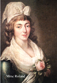 Les pôles d'influence : le salon de Madame Roland: Belle et instruite, de condition modeste Marie-Jeanne Philipon dite Manon , épouse Roland de 20 ans son aîné en 1780. Ils s'installent à Paris en 1790. Manon écrit alors dans le patriote français de Brissot et tient salon. Elle recevra tout l'état major de la Gironde dont elle sera l'inspiratrice. Robespierre dénoncera le triumvirat féminin ( Mme Roland, Mme de Staël, Mme Condorcet) . Cependant elle fera tout pour éviter la rupture entre Robespierre qu'elle estime et les Brissotins. Après le 10 Août 1792 elle concevra une haine violente contre Robespierre et Danton. Elle est arrêtée le 2 juin 1793 avec les députés girondins et sera exécutée le 8 Novembre 1793. Son mari qui avait réussi à échapper à l'arrestation, apprenant l'exécution de sa femme se suicide