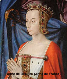 La régence d'Anne de Beaujeu![]() Lorsque Louis 11 meurt en 1483, Charles 8 n'a que 13 ans, selon la volonté de Louis 11 c'est Anne de Beaujeu sa sœur âgée de 23 ans mariée à Pierre de Beaujeu duc de Bourbon qui assurera la régence. Louis 11 avait désigné sa fille avant sa mort comme régente "Anne c'est la moins folle femme du monde, car, de sages, il n'y en a point" Anne a une forte personnalité , elle terrifie son jeune frère. Elle aurait souhaitée être mariée à Louis d'Orléans mais celui-ci en préféra une autre. Son amour se changera en haine. En 1484 Les Etats sont réunis, c'est la première fois qu'ils seront qualifiés de "Généraux". Ils confirment la régence afin de faire taire les nobles qui s'agitent.