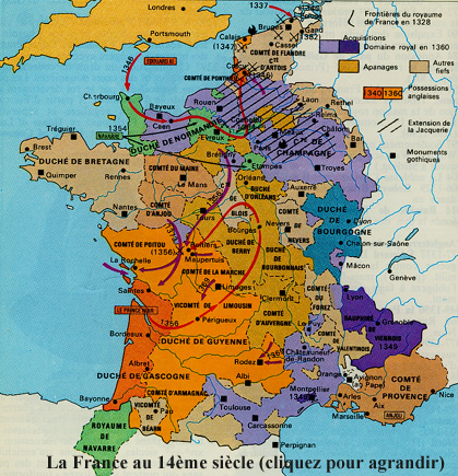 Le Moyen Âge. -ère féodale- Les hostilités entre Edouard 2 d'Angleterre et le roi de France vont s'aggraver à la mort de Charles 4 sans descendant mâle. Le fils de Edouard 2, petit fils de Philippe le Bel par les femmes, neveu de Charles 4 va revendiquer le trône de France. Le roi d'Angleterre monter sur le trône de France? C'était impensable. Déjà Guillaume le Conquérant suzerain de Normandie devenu roi d'Angleterre (1066) puis la Guyenne apportée en dot par Aliénor d'Aquitaine lors de son mariage (1152) avec le Plantagenêt et maintenant l'Anglais veut le trône de France. Temps des croisades - début de la guerre de 100 ans avec les Anglais (1337 - 1453). |